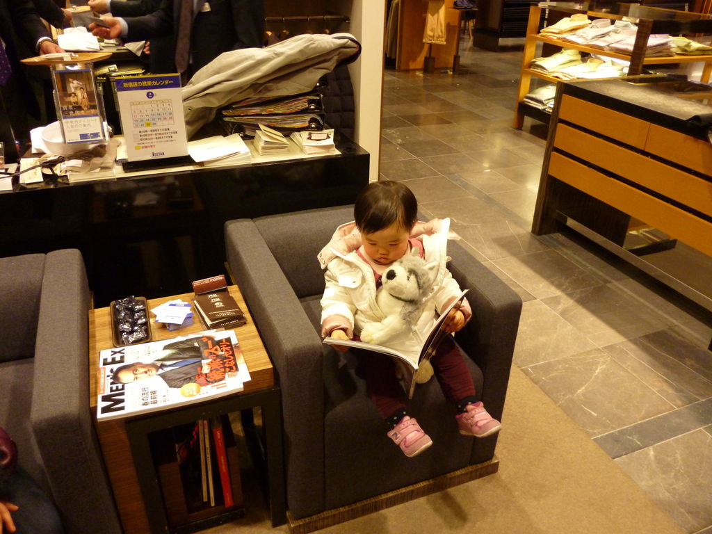 写真はダッフィーのお店。伊勢丹メンズでパパがお買い物時に気づいたらメンズUOMOの今月号を読んでいたパタちゃん。洋服の情報をしっかり読んでました。新宿の千住博の滝の図でパチリ。