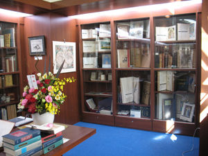 世界の革装丁本が並び、まさに世界のライブラリーといった感がある。