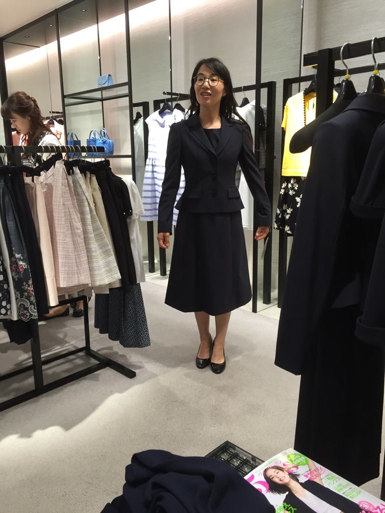 やはりお受験というシチュエーションにふさわしい「濃紺スーツ」という選択がベターだと思います。横並びとも取れてしまいますが、一方で「良識をふまえているか」という問いに対する答えとも言えます。