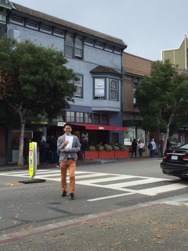 この季節、四季のある街、SFですからかなり肌寒いんです。アフラックは持ち込んだイネスのショートダウン、アッピーノは昨日アバクロで急きょ購入したフーディージッパー白。僕はBARENAのナイロンジャケットが肝煎り。