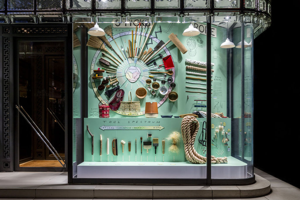 プロダクトデザイナーのマイク・エーブルソンは長年にわたり、独自のリサーチを続けています。「ツール・ルーツ」と名付けたリサーチでは、道具の形がどのように互いに影響し、つながりあい、変化していくかを考えていきます。今回は「オブジェに宿るもの」というテーマに導かれ、メゾンエルメスのウィンドウに彼の壮大なリサーチの内容を再現します。