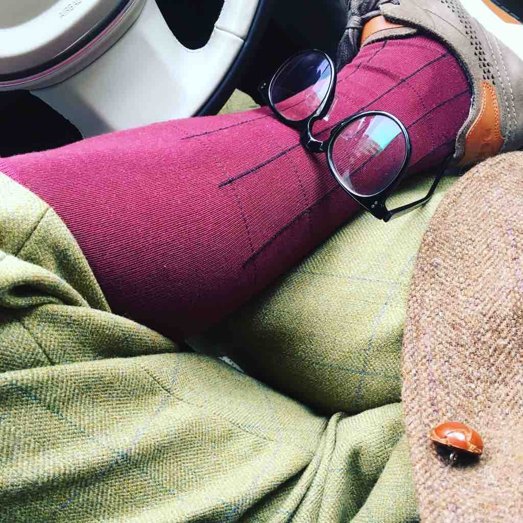 こういうパンツにはこういうボルドーのロングソックスやボストングラスが合います