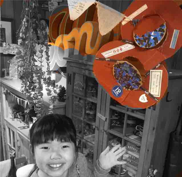 さらにそこにビンテージの紙やポスタルコの包装紙を貼ったりして丸穴には折り紙で