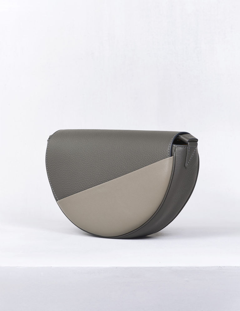 トリヨン・ブルーグレーとヴォ―リス・トープグレーのスモールメッセンジャーバッグ。ショルダーストラップは3段階に長さ調節が可能です。内側にファスナー付きポケット。裏地は本体とコントラストのシェーブル・サンフラワーを使用。