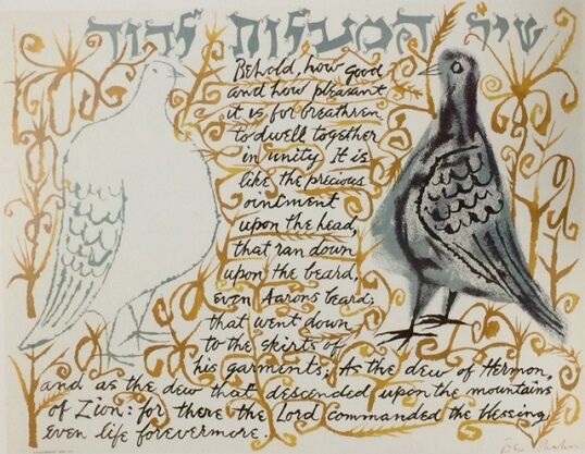 Ben Shahn, Psalm 133, 1963. Lithograph, sheet: 20 3/4 × 27in. (52.7 × 68.6 cm) Image: 19 1/2 × 26in. (49.5 × 66 cm). Gift of Sylvan Cole, Jr.; 2004.901. c Estate of Ben Shahn / Licensed by VAGA at Artists Rights Society (ARS), New York. Ben Shahn (1898-1969)."Psalm 133." Lithograph printed in color, 1963. Signed in red brush, lower right. Edition approximately 200. Paper size 20 3/4 x 26 7/8" (52.7 x 68.2 cm).